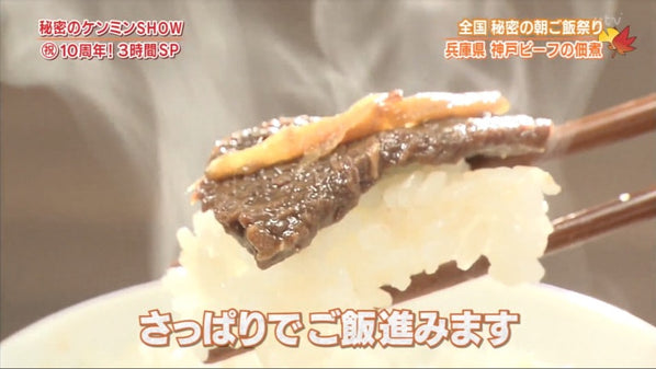 原材料 | 佃煮(牛肉(兵庫県産神戸牛)、しょうが、しょうゆ、合成清酒、砂糖、水あめ/カラメル色素、調味料、(一部に小麦・牛肉・大豆を含む))、 しぐれ煮(牛肉(兵庫県産神戸牛)、しょうゆ、みりん、合成清酒、砂糖、山椒加工品(実山椒、食塩)/カラメル色素、調味料(アミノ酸等)、酸味料(一部に小麦・牛肉・大豆を含む)) |