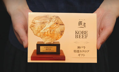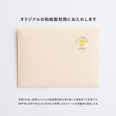 手触りの良い辰屋オリジナルの和紙製封筒は落ち着いた雰囲気でご好評です。「神戸肉」の印である「のじぎく判」が箔押しされたシールが高級感を演出します。