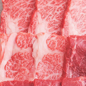 神戸牛ならではの素材の良さが表れる赤身「モモ」と、肉汁が溢れんばかりの、焼肉の大トロと言われる「カルビ(バラ)」が半量ずつセットになっています。